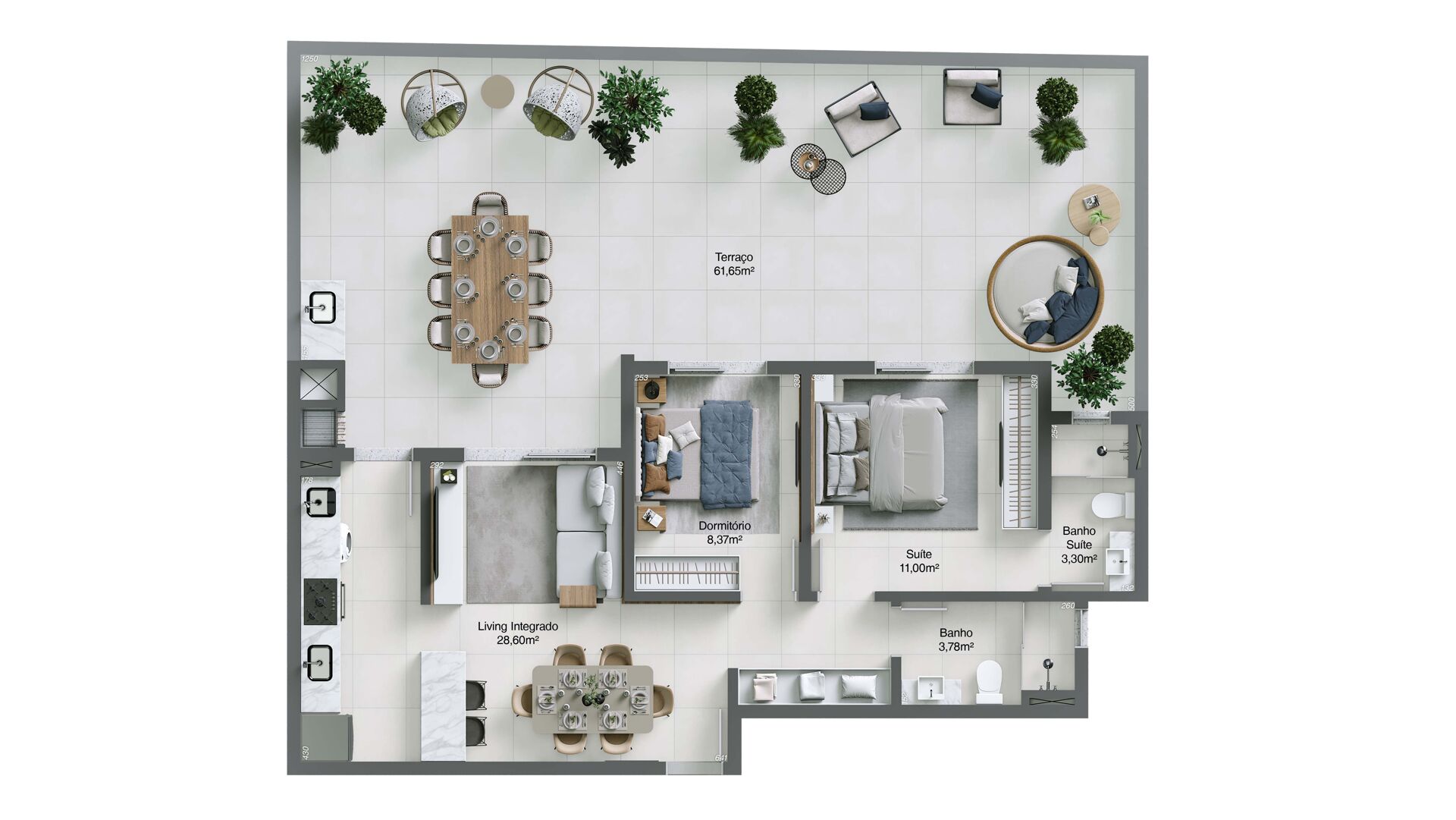 Este apartamento conta com um amplo terraço privativo de 61,65m², equipado com churrasqueira a carvão, oferecendo um espaço ideal para momentos de lazer, confraternizações e para aproveitar um ambiente externo exclusivo.